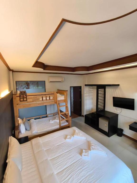 The staff was friendly, the room was clean, and the bed was very soft with plenty of pillows provided. However, the bathroom still had a slight musty smell. There was a swimming pool, but unfortunately, when I went, the hotel was closed for maintenance. There are gardens, a restaurant, a fish pond, and a sandy beach area for kids to play, which the children really enjoyed. Parking is available for both motorcycles and cars at the back, which is convenient and close to 7-Eleven, Big C, Central, and a hospital in the middle of the shopping center. I will definitely stay again next time.