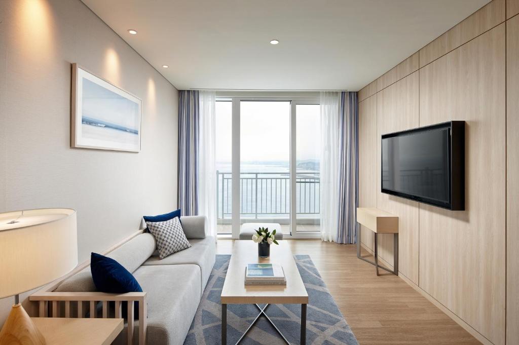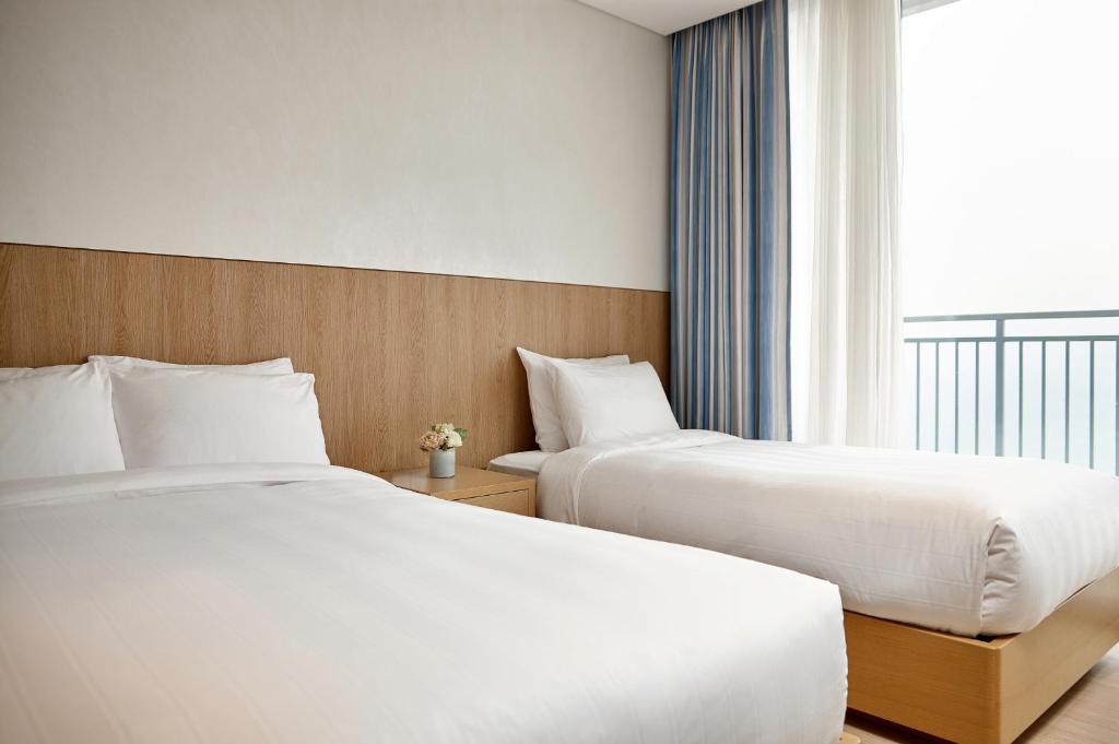 I visited during Chuseok with my 6-year-old child. All the staff were friendly, and the service was very good. Above all, the hotel’s internal facilities were really diverse, which I appreciated. There was a café, Lotteria, a souvenir shop, a convenience store, a karaoke room, a kids’ playground, a swimming pool, and even a water park! Right in front of the hotel, there was a beautiful path leading down to the sea, and nearby there were a beach and a Ferris wheel, so even with bad weather, there were plenty of things to enjoy with my child. The breakfast was delicious. Although the menu wasn’t very diverse, it had all the basic items, and there was a separate corner for kids which was satisfying. There was almost no waiting line, and even if it briefly formed, it disappeared quickly, so there was no inconvenience. The disappointing point was that the room was overall dark. In particular, there was no lighting on the table, making it a bit inconvenient for my child to read or do crafts. There was also no light on the terrace, so we couldn't use it much at night. Additionally, there was no freezer in the refrigerator, and I was a bit surprised that when I requested a stool for the bathroom, they said it wasn’t provided. It was a family room, but the sink was quite high, making it difficult for my 6-year-old to wash his hands alone. While the room and bathroom were clean, there was quite a bit of dust and hair coming out from between the sofa cushions, which was disappointing. Still, these issues did not detract from my overall satisfaction. I would definitely recommend it as a family travel destination for those with children. Thanks to the various facilities, we had a pleasant and fulfilling time, and they gave us coffee coupons in the lounge, where the bread we had was really delicious. 😊