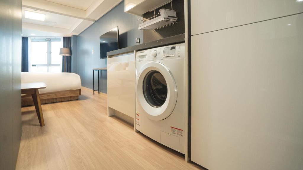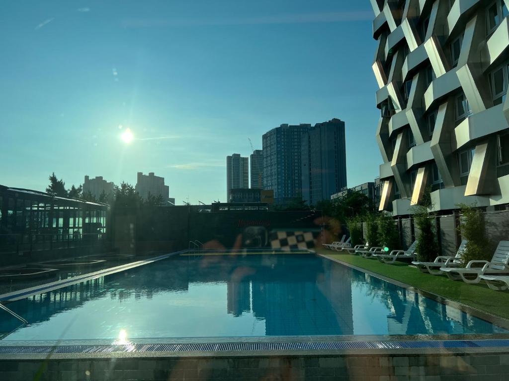First of all, it's located close to Sokcho Beach (within a 10-minute walk with an elementary school child), right next to an area with many restaurants, so the location is fantastic. It's especially nice that it's a hotel with a swimming pool, so when you want to play in the water with kids without going to the sea, or enjoy night swimming, it's great. There are always safety personnel on duty, which is comforting. The pool isn't very large, but it's perfect for young children in kindergarten and elementary school to have fun, and the snacks sold at the convenience store are affordable, as are the sunbeds. (There is a changing room, but no shower, so you'll have to go back to your room to shower.) One of the best things is that each room has a washing machine, allowing you to wash and spin-dry clothes daily. It was also excellent that there is a small bathtub in each bathroom. The staff were friendly, and there were many reviews mentioning soundproofing issues, but luckily I was given a corner room on the top 7th floor, so I had no soundproofing problems. Since many reviews pointed this out, guests are already aware and tend to be cautious about it. Additionally, having a convenience store on the first floor was very convenient. The underground parking can be insufficient when crowded, but there is a free public parking lot right next to it, so it wasn't too much of an inconvenience. I stayed in an ocean view room, which didn't have a wide-open view of the sea but rather the harbor's water, mainly seeing fishing boats, shipyards, and the city across from it, which also has its charm. There are four elevators in operation, so there were no issues with crowding at the elevators. The breakfast buffet had a limited number of food options, and honestly, the taste and quality of the ingredients were just mediocre. However, as it's a buffet, it allows for a hearty breakfast so you can spend the whole day playing at the beach. The room felt small because it was packed with various amenities (shoe cabinet, wardrobe, drying rack, washing machine, refrigerator, etc.). It especially felt smaller near the door. But this is a trade-off for having access to those amenities. Also, the refrigerator is quite large, which was great. The bed was comfy, and the overall environment was pleasant. It feels like the hotel management has put a lot of thought into making the experience enjoyable for guests. I recommend it if you're coming with family for a good value trip!
