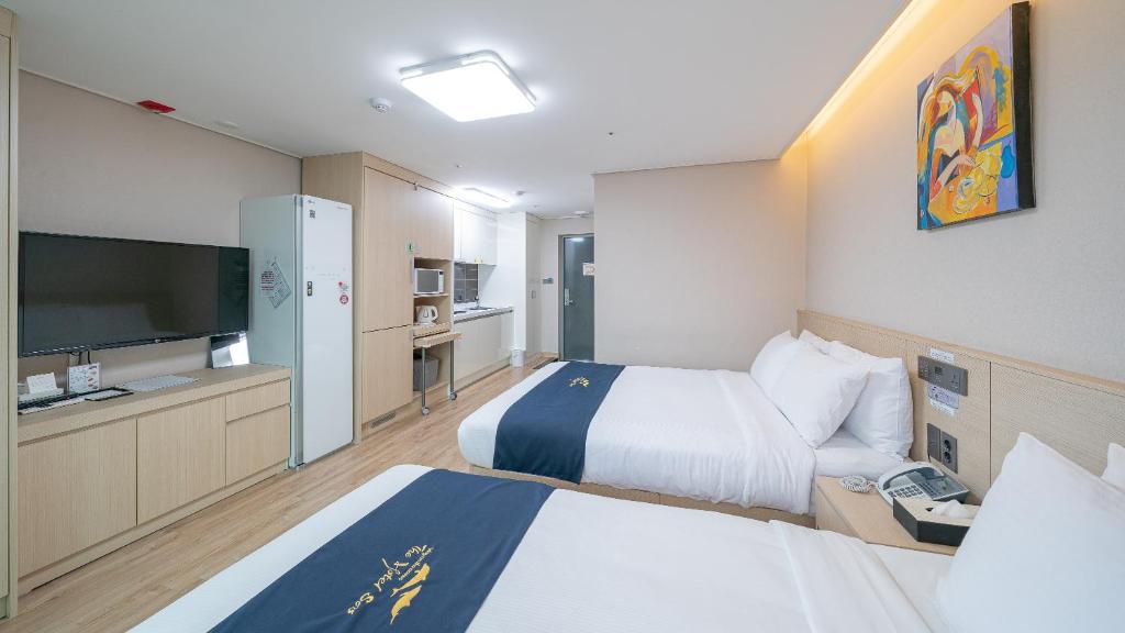 I was concerned about the accommodation since it was a trip with my child, but it was clean and not far from tourist attractions, and there was a convenience store in the building, which was convenient to use. The room had a separate living area, so it was comfortable to watch TV alone while my child slept first. However, one drawback was that the location is right next to a big bridge, but you have to go around to enter – it's nice to have a large supermarket on the way in. They call it a kitchen, but you can only use the sink for water – there was a microwave, so it wasn't too inconvenient. The road is right in front of the room, and if you open the window, there's a lot of car noise – since it's winter, I only opened the window for ventilation, so it wasn't a major inconvenience. In terms of cost-effectiveness, I would consider using this place again.