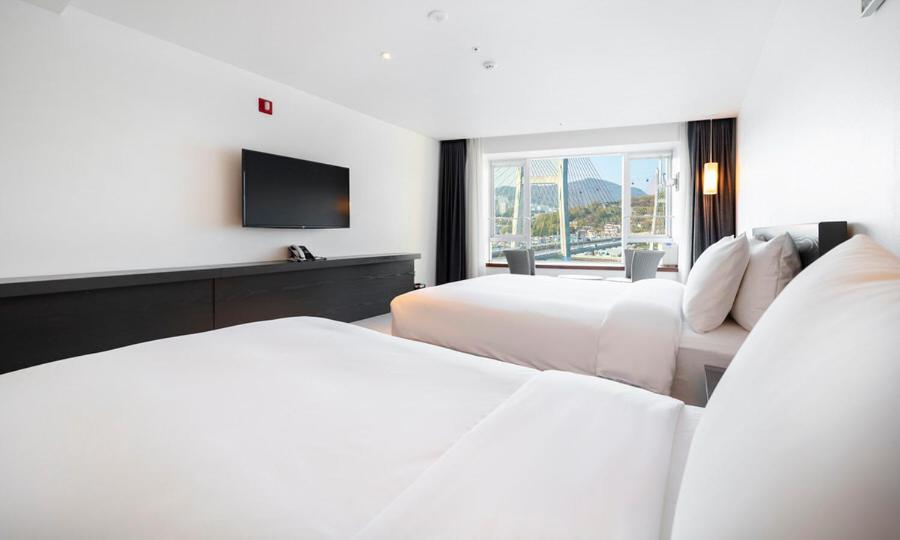 ✔️ The price is usually okay. Visiting during Christmas, the price was honestly somewhat more expensive than usual, but compared to nearby hotels, it is reasonable. However, I was really satisfied with the view. Especially, the higher the floor, the better the view; I stayed on the 8th floor and the view was quite impressive. ✔️ Room condition and usage review I used a twin room, but it was a bit disappointing that there was no table in the room. Still, the scenery outside the window was so nice that I was quite satisfied with the time spent in the room. The night view was especially beautiful, and the bridge view is illuminated until 3 a.m. You can also see the cable car running over the bridge. I recommend only using the cable car one way and taking a taxi back for both price and satisfaction. One ride is enough to be satisfied. It’s a bit scary when it’s windy. Riding at sunset is pretty, but the sea color is beautiful during the day too, so the view is great. ✔️ Surroundings and transportation There is almost no commercial area around the accommodation, making it difficult to walk, so taxi transportation is essential. I moved using KakaoT, and the cable car, Romantic Pocha Street, Aquarium, Yi Sun-sin Plaza, Expo, and cruise dock are all within 10 minutes by taxi, so the location itself was quite good. There are also calling taxi business cards in the lobby. There is a 1,000 won calling fee. The lobby is well-prepared with tourist maps and recommended restaurant materials, which are nice to refer to. ✔️ Delivery & room service I used both delivery food and room service. The delivery was precisely brought to the door, and there were no inconveniences in general. ✔️ Convenience store usage notes The convenience store on the second floor has a somewhat unique operation. Alcohol sales are only possible from 6 p.m. to midnight. After that, it switches to unmanned operation. All products excluding alcohol can be purchased even in the early hours. The price of soju at the convenience store is 1,800 won. ✔️ Don’t forget the amenities Shower gel, shampoo, and conditioner are provided, but razors, toothpaste, and toothbrushes are not provided in the room. It’s better for those who need them to bring them in advance. They can be purchased at the convenience store. ✔️ Breakfast review I felt that the breakfast composition matched the price range. Those who don’t find it to their taste can stick to bread, yogurt, and fruits, which are safe choices, and the coffee is better than expected. Breakfast starts at 7:30 a.m., and it gets crowded after 8:30 a.m. There are also Korean dishes prepared, so if you're traveling with adults, I recommend reserving breakfast for at least one meal. Most restaurants in Yeosu open after 10-11 a.m., so breakfast was especially useful for those with morning schedules. ✔️ Other notes Wine glasses and openers can be rented at the lobby upon request. ✔️ Overall review If you prefer a quiet and private atmosphere, this accommodation is a good match. I recommend it to those who value the view and ambiance. It’s just a bit disappointing that there’s no table. The view is good, but I'd like to eat while looking at it. You can place your food on the windowsill and eat.
